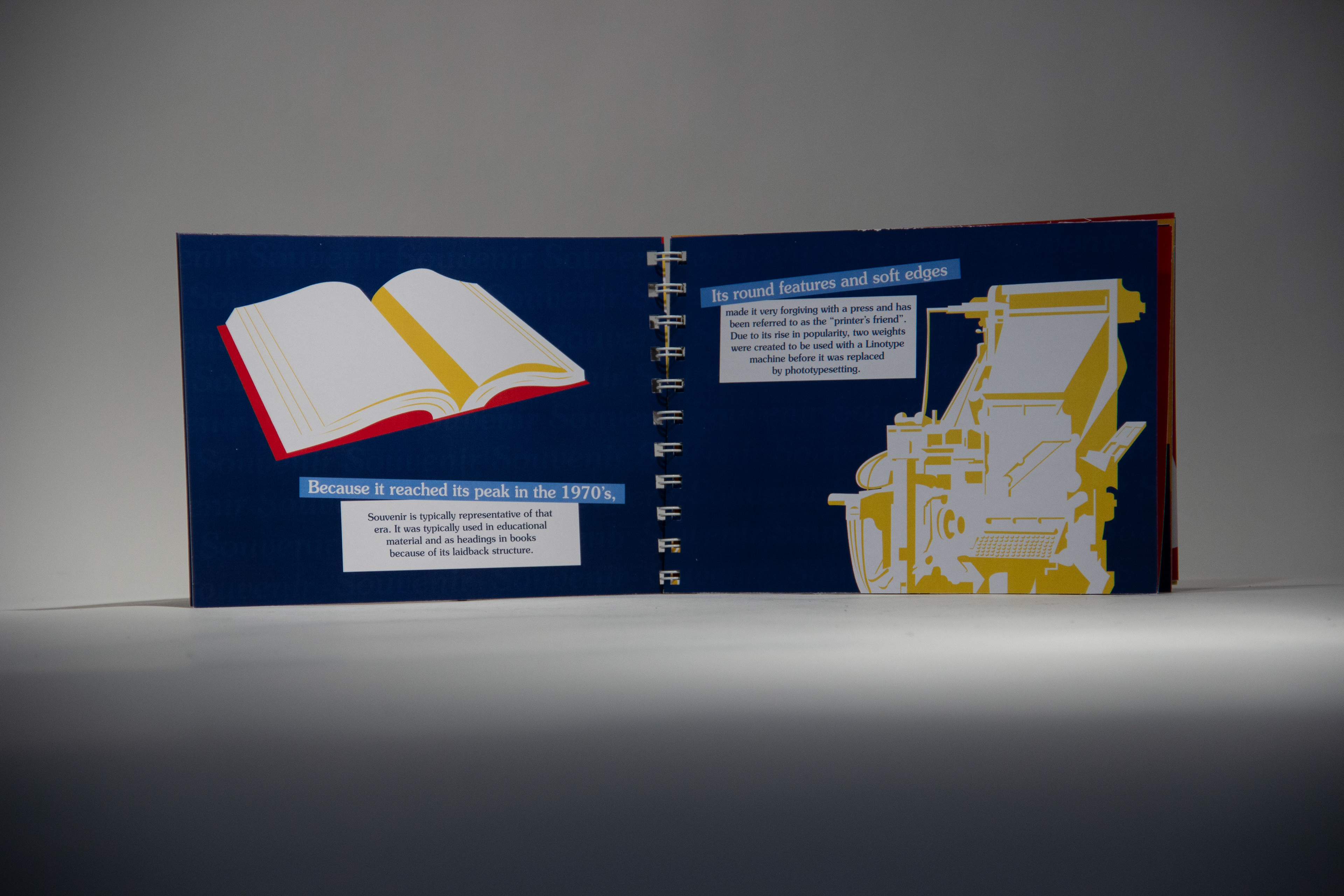 Presented at my GAND 200 Assessments in the Spring of 2019. This project was the Typographic Spec Book. Our team chose the typeface Souvenir to research and to showcase, only using Souvenir throughout the book and giving the history of the typeface. We used a double-gate fold to display the full alphabet, numbers, and symbols of Souvenir as well as some of its notable characteristics. All the spreads here were the spreads I created, plus 3 more that my teammates created (not