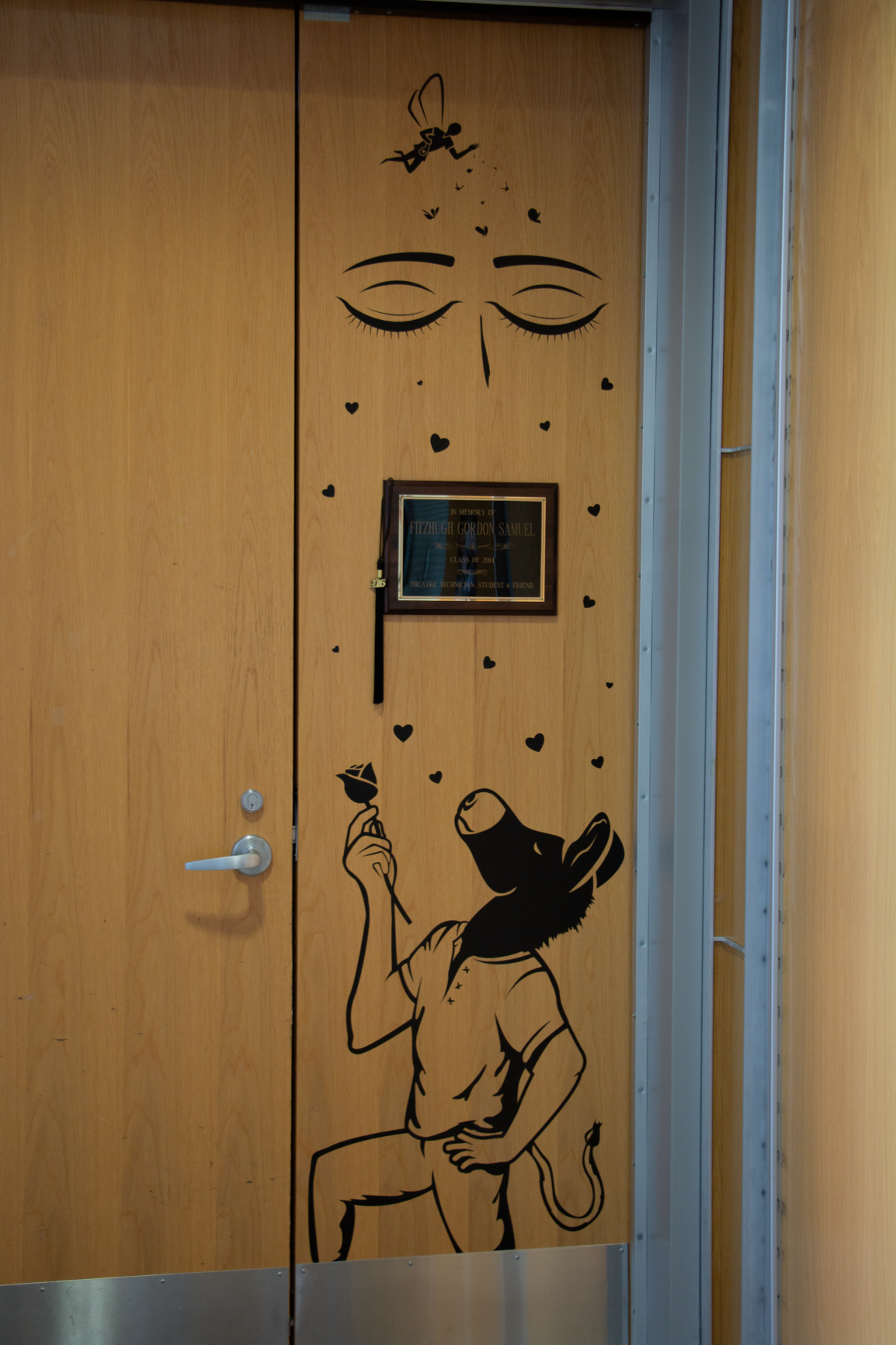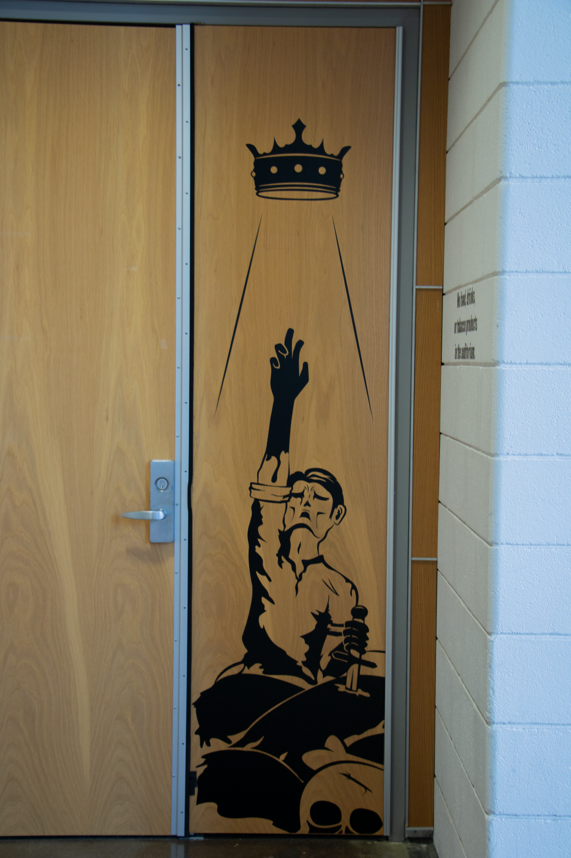 I did some research into particularly well-known plays, and although I wasn't surprised that a majority of them were Shakespeare, I then had to choose which ones I could convey clearly to people quickly passing by. The Mainstage theatre door design was based on Macbeth (left), while the Lab theatre depicts A Midsummer Night's Dream (right). Figuring out a way to summarize these famous Shakespeare plays was the most challenging part, especially since I wanted to only work with one color. For the Macbeth illustration, I chose to show Macbeth appearing gaunt, depraved, and desperate while he climbs over the pile of bodies. Yet despite all his efforts, is still unable to achieve his wicked dream of becoming king. For the illustration of A Midsummer Night's Dream, I had to switch gears and convey a lighter romantic comedy. I chose the iconic moment when the fairy, Puck, sprinkles a love potion upon Titania's eyelids while she slept, causing her to fall in love with Bottom. Because there was a dedication plaque on the Lab theatre door panel, I chose to fill the space between Titania and Bottom with hearts of varying size. During installation, I could then pick and choose how to arrange the hearts to work around the plaque.